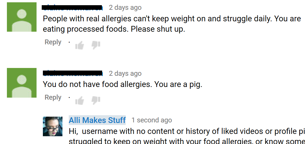 And let’s be real, you probably didn’t mean for these comments to garner an actual response otherwise you wouldn’t have stooped to body-shaming or calling me a liar. You should watch my other videos! In some of them you can see a lot more of my fat arms, stretch marks, and hairy pits. I’ve got killer double chin in quite a few of them (as will happen when you’re stuffing your face on camera). Calling me fat because of it is probably not going to phase me, though. So, while I’m enjoying making this response I’m also informing you that I DO moderate comments, and if you call another user fat on my channel (not that I have many commenters, let’s be honest, it’s not like you’re going after somebody actually popular) I’ll delete your comment and block you.